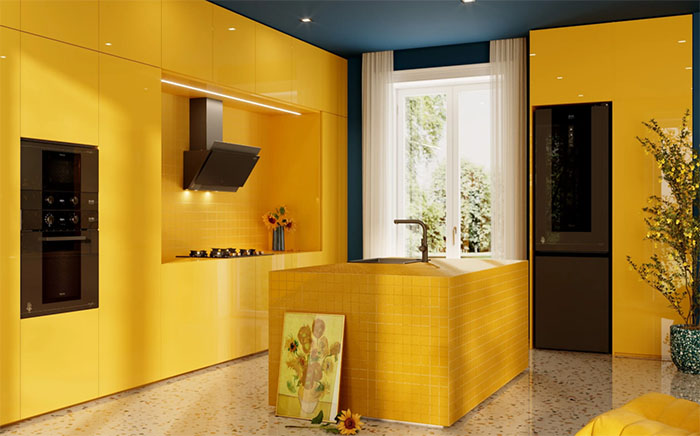 Použitím žlutých, hořčicových a zemitých tónů docílíte zářivého vzhledu s odkazem na přírodu a léto. Zelené tóny, některé tlumenější, jiné olivově tónované, však pomáhají vytvořit klidnou, vyrovnanou a autentickou atmosféru v kuchyních všech velikostí. Pro posílení tohoto pocitu je možné využít šampaňské povrchové úpravy a matných nátěrů – například na spotřebičích. Dodají kuchyni sofistikovaný nádech a doplňují celkový design. Výsledkem je vizuální reinterpretace, která proměňuje předměty denní potřeby v kousky, které mají duši.