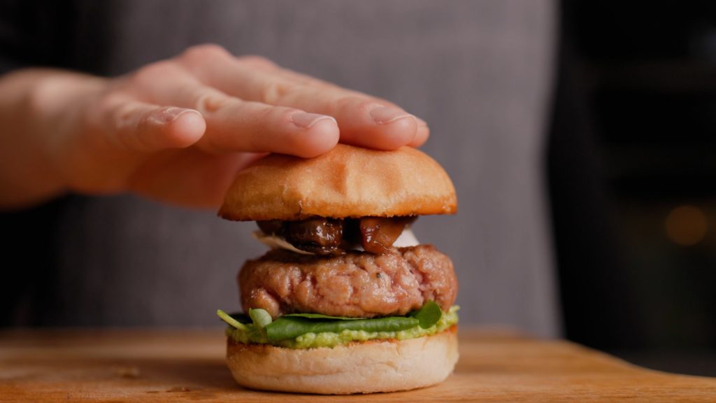 - Heat the halved buns in a frying pan with butter and assemble the hamburger: At the base, place mashed avocado with lime juice, watercress, the hamburger, cheese slices and finally the caramelised mushrooms. Close the burger.