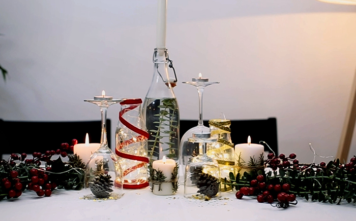 Puedes crear unas botellas de luces con materiales que podrás encontrar en casa o en cualquier pequeño comercio del barrio. Hazte con unas botellas de vidrio, velas de tamaño acorde, 1 copa de vino o similar, cintas de colores, ramitas verdes, piñas y pequeñas guirnaldas de luces.