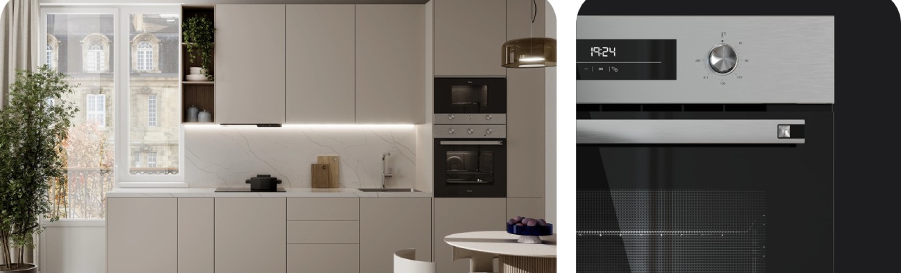 There is another kind of self-cleaning that works with a lower temperature than pyrolysis but is still quite efficient and convenient: steam cleaning. Systems like HydroClean —developed by Teka— clean your oven with less intensity but with all the benefits of heat and water to remove stains and dirt. It is usually gentler and quicker than pyrolysis, and it is designed for lighter messes, like a sort of regular maintenance. When the cleaning is done, you just need to wipe away the dirt.