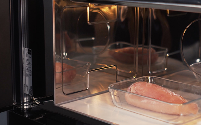 Your model may offer two defrost modes: by weight and by time. Use the time setting for smaller pieces and the weight setting for larger ones. Your user manual will include a handy table with recommended weights and times. It’s worth a look, because a 300g chicken breast and a cooked sea bream don’t exactly need the same treatment.