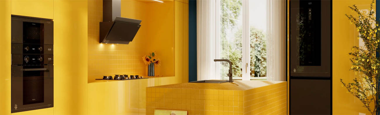 Dark kitchen with black and yellow decoration and Vang Gogh Museum home edition appliances by Teka