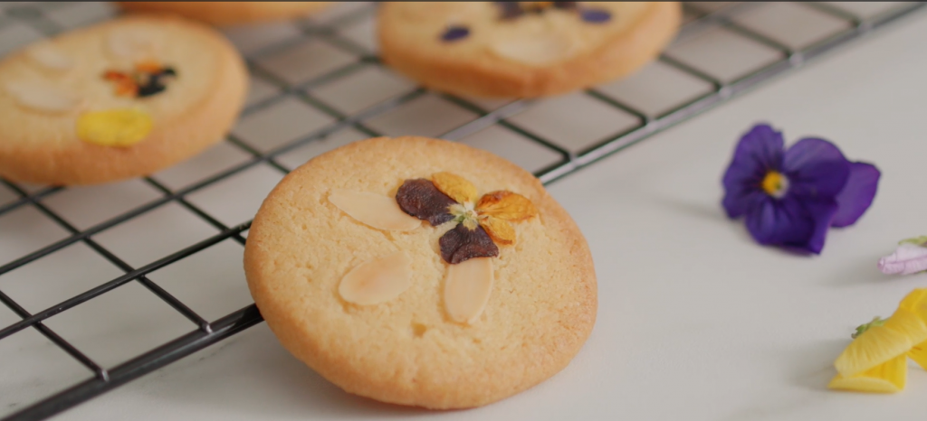 Udekoruj każde ciastko trzema płatkami migdałów i jadalnymi kwiatami do smaku. Delikatnie dociśnij wierzch, aby przykleić kwiaty do ciasta i piecz przez 10-15 minut.