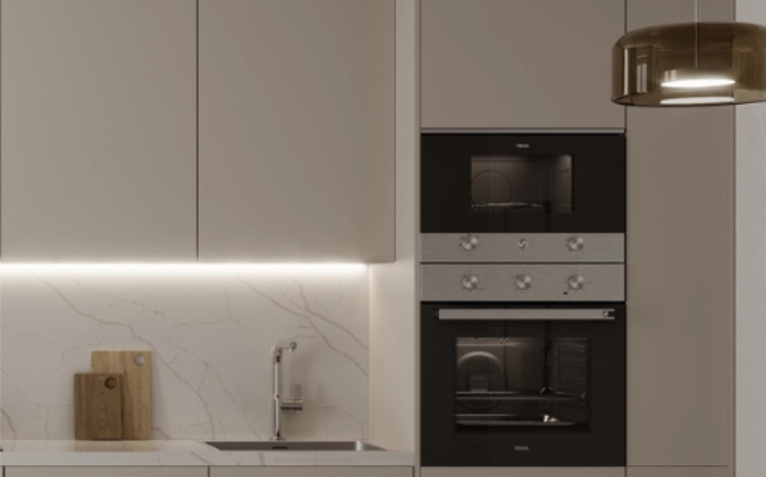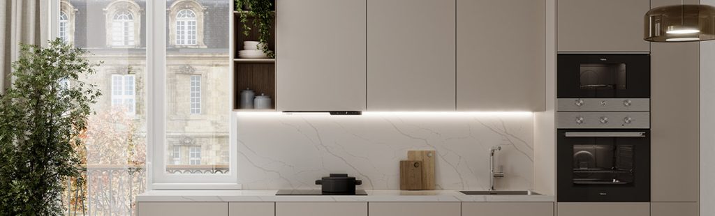 • Postaw na spójną zabudowę nad płytą kuchenną – wybieraj rozwiązania, które wpisują się w linię szafek i nie wprowadzają wizualnego chaosu. Ukryte lub zintegrowane elementy pomagają uporządkować przestrzeń.