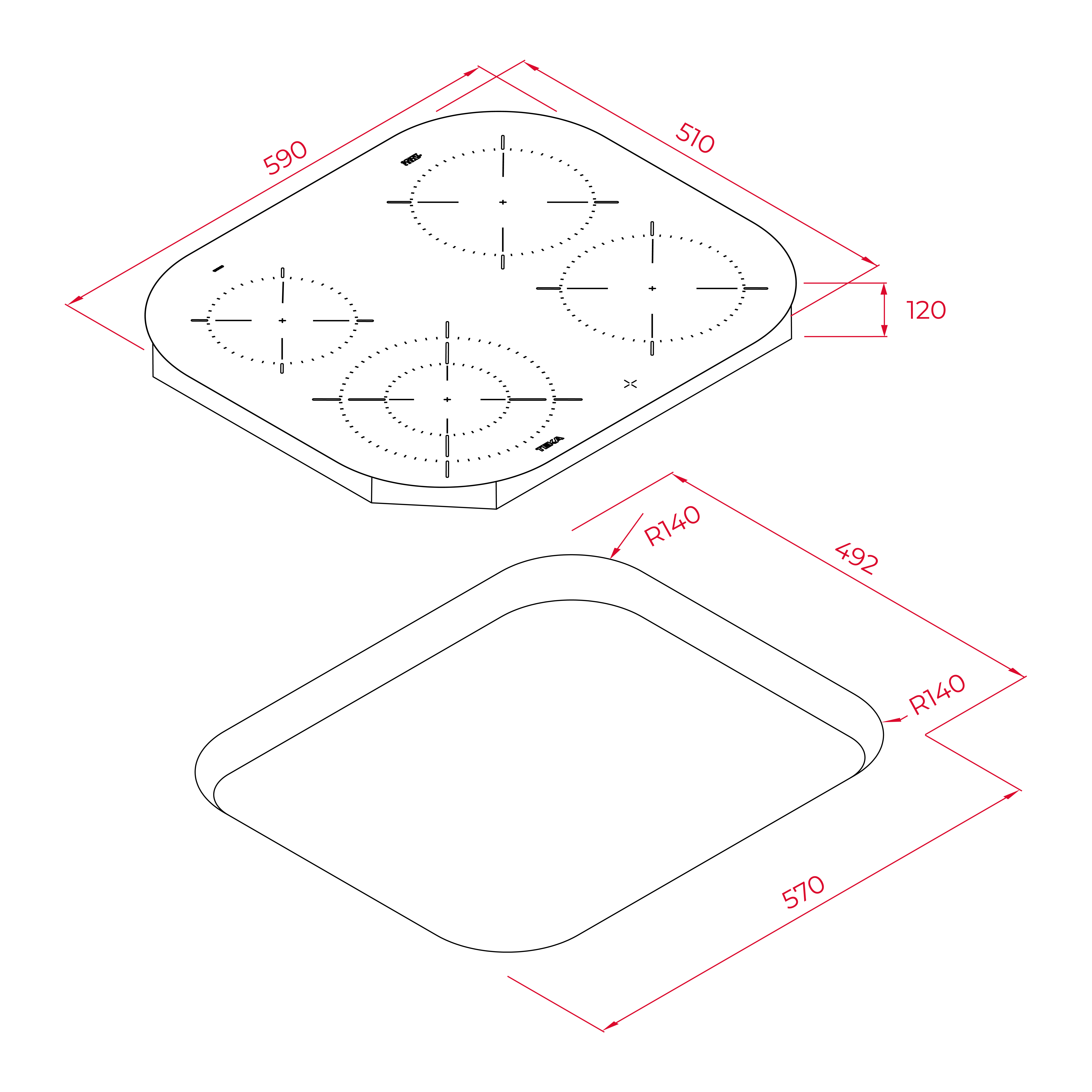 - 4 zonas: 1 (Ø 210/120 mm) + 2 (Ø 180 mm) + 1 (Ø 145 mm)